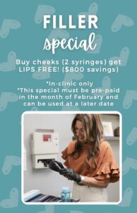 - Filler Special: Buy cheeks (2 syringes) and receive LIPS FREE — ($800 savings!)